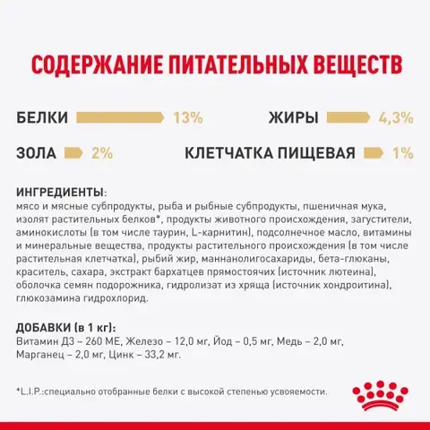 мясо и мясные субпродукты, рыба и рыбные субпродукты, пшеничная мука, изолят растительных белков*, продукты животного происхождения, загустители, аминокислоты (в том числе таурин, L-карнитин), подсолнечное масло, витамины и минеральные вещества, продукты растительного происхождения (в том числе растительная клетчатка), рыбий жир, маннанолигосахариды, бета-глюканы, краситель, сахара, экстракт бархатцев прямостоячих (источник лютеина), оболочка семян подорожника, гидролизат из хряща (источник хондроитина), глюкозамина гидрохлорид