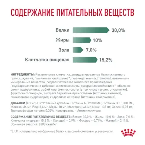 Ингредиенты: растительная клетчатка, дегидратированные белки животного происхождения, пшеничная клейковина*, пшеница, маниок (тапиока), витамины и минеральные вещества, гидролизат белков животного происхождения (вкусоароматические добавки), животные жиры, кукурузная клейковина*, оболочка семян подорожника, рыбий жир, аминокислоты (в том числе таурин, L-карнитин), фруктоолигосахариды, экстракт бархатцев прямостоячих (источник лютеина), глюкозамина гидрохлорид, гидролизат из хряща (источник хондроитина).