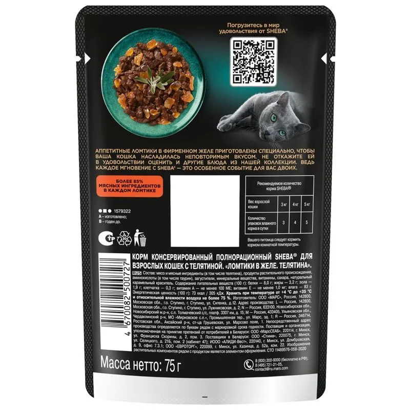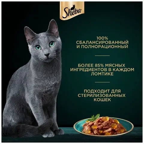 Полнорационный консервированный ломтики телятины в желе от SHEBA – это всегда свежее угощение для Вашего питомца, который точно не устоит перед таким соблазнительным блюдом!