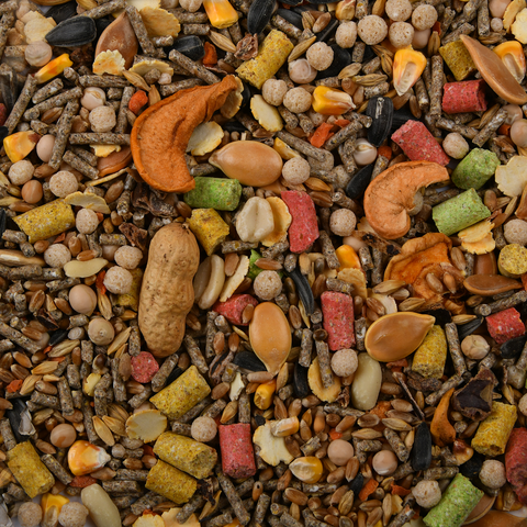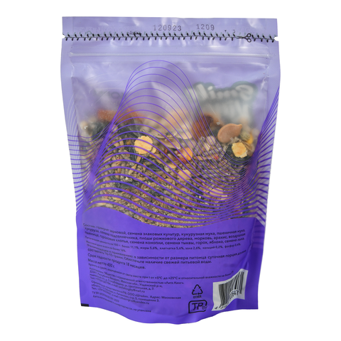 Состав: Гранулят зерновой, семена злаковых культур, кукурузная мука, пшеничная мука, кукуруза, семена подсолнечника, плоды рожкового дерева, морковь, арахис, воздушная пшеница, гороховые хлопья, семена конопли, семена тыквы, горох, яблоко, семена льна.