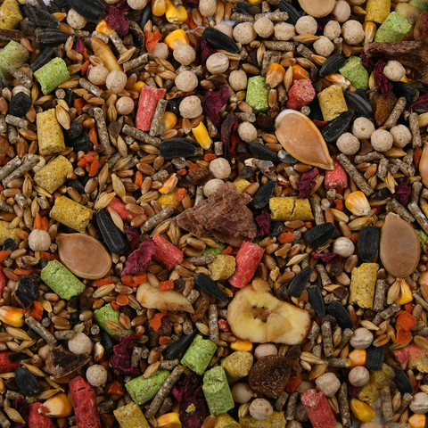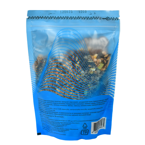 Состав: Семена злаковых культур, гранулят зерновой, кукрузная мука, пшеничная мука, кукуруза, гречиха, горох, семена подсолнечника, воздушная пшеница, семена тыквы, плоды рожкового дерева, изюм, морковь, семена конопли, банан, свекла, семена льна, говяжий субпродукт дегидированный.
