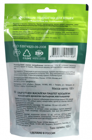Хрустящие подушечки для кошек с паштетом из говядины – это вкусное и полезное лакомство. Паштет, содержащийся внутри каждой подушечки, имеет мягкую однородную консистенцию в виде мусса и неповторимый нежный вкус. Благодаря бережной технологии изготовления паштета, удалось сохранить полезные свойства мяса говядины, поэтому лакомство богато ценным белком, важнейшими минералами и витаминами.