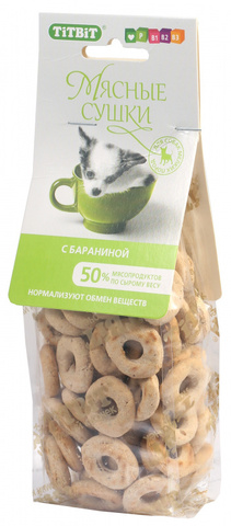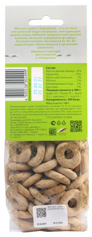 Мясные сушки с бараниной – это печенье классической округлой формы, повторяющей форму всеми любимой традиционной русской выпечки. Высокое содержание фосфора, богатый комплекс витаминов В1, В2, В3 нормализуют обмен веществ в организме животного. Идеально подходят для угощения и поощрения собак мелких пород. Не содержат искусственных красителей, консервантов, ароматизаторов.