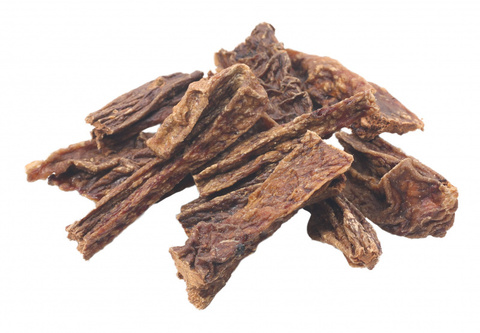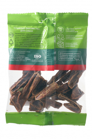 Высушенное говяжье вымя, порезанное на кусочки до 5 см. Нежное лакомство со вкусом натурального молока. Богато эластином и коллагеном, которые отвечают за состояние шерсти и кожи. Имеет большую энергетическую ценность из-за повышенного содержания жира.