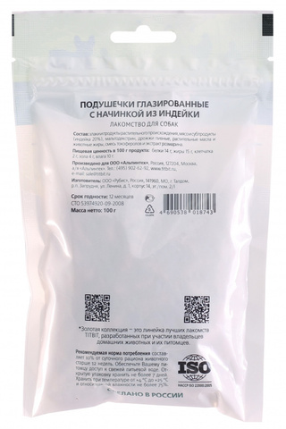 Золотая коллекция – это линейка лучших лакомств TITBIT, разработанных при участии владельцев домашних животных и их питомцев. Подушечки с начинкой - это аппетитные лакомства, которые, благодаря нежной мясной начинке и уникальному верхнему слою, имеют привлекательный внешний вид и невероятный вкус. Хрустящие подушечки в мясной обливке, напоминающей кондитерскую глазурь для людей. Как и глазурь, обливка придает особый вкус продукту, который понравится даже самому привередливому питомцу. Она абсолютно безопасна и не содержит сахара. Индейка, входящая в основу начинки, является легкоусвояемым источником высококачественного животного белка, витаминов и основных микроэлементов.