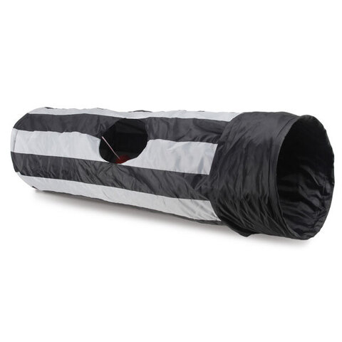 Нейлоновый игровой туннель для кошек контрастной расцветки. Мягкий, просторный, шуршащий и очень теплый, такой туннель станет не только прекрасным аксессуаром для активной игры, но и отличным местом для отдыха после интенсивных "кардионагрузок". Форма изделия держится, благодаря прочному металлическому каркасу, выход может быть затянут на тесемку, а окошко "для наблюдения и охоты" и пушистая игрушка на резинке станут дополнительными элементами для увлекательной игры. Размер изделия d250х900мм. При этом в сложенном виде такой туннель совсем не занимает места.