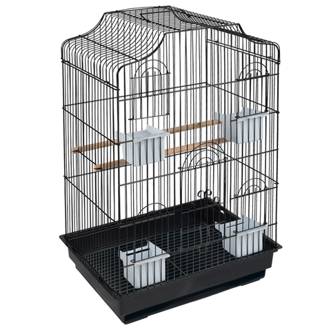 Оригинальная клетка для птиц с фигурной крышей - полезный аксессуар для владельцев пернатых питомцев. Прочная, стильная и удобная, такая клетка займет достойное место в любом интерьере, отвечая всем жизненным потребностям пернатых питомцев. В комплектацию изделия входят 2 кормушки-поилки, 2 жердочки. Клетка также оборудована удобной ручкой для переноски и специальным пластиковым наружным поддоном, облегчающим процесс уборки. Цвет: черный. Размер изделия: 470х360х680мм.
