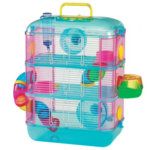 Яркая трехэтажная клетка прямоугольной формы - целый развлекательный комплекс для грызуна, который занимает немного места и отлично подходит для мелких домашних животных вроде крыс, мышей и хомяков. В комплектацию изделия также входят: пластиковая миска, поилка с носиком, уютный домик, труба-тоннель и беговое колесо. Кроме того, клетка оборудована удобной ручкой на крыше, облегчающей процесс переноски изделия. Размер изделия: 400х260х530мм.
