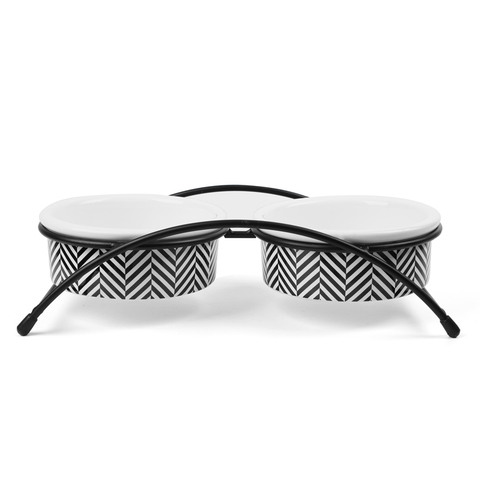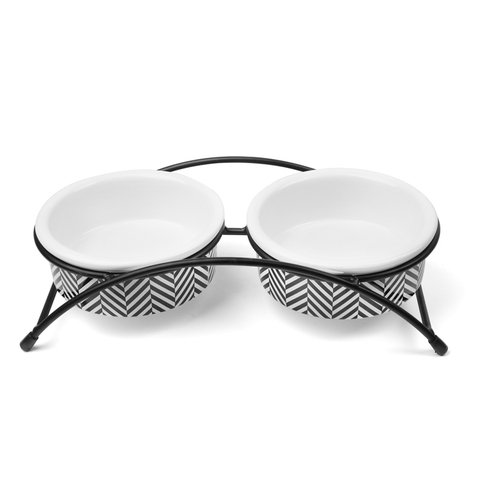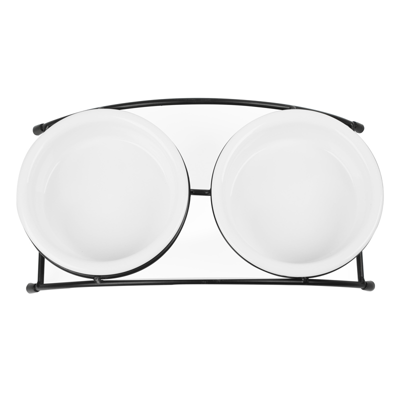 Этот функциональный комплект из двух универсальных круглых мисок на подставке выполнен из керамики высокого качества и отлично подходит для кошек и собак мелких пород. Такие миски идеальны как для воды, так и для корма разной консистенции. Изделие комфортно для питомца и легко моется под струей проточной воды с использованием моющих бытовых средств. А эффектный дизайн стилизованной под ковку подставки позволит ей стать украшением любого интерьера. Цвет изделия: черно-белый. Размер изделия: d дна - 112мм; d в верхней части - 125мм; высота - 45мм. Размер подставки - 280*135*65мм. Объем - 2*0,25л