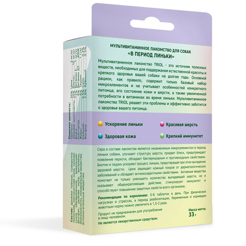 Мультивитаминное лакомство для собак «В период линьки» TRIOL - это источник полезных веществ, необходимых для поддержания естественной красоты и крепкого здоровья вашей собаки на долгие годы. Сера в составе лакомства является незаменимым микроэлементом в период линьки собаки, улучшает структуру шерсти, придает блеск, предупреждает появление перхоти, обладает бактерицидным и противозудным свойством. Биотин и таурин ускоряют процесс линьки, предотвращая при этом выпадение здоровой шерсти. Цинк защищает кожный покров от дерматологических заболеваний и обладает антиоксидантными свойствами. Активные вещества помогают не только уменьшить количество выпадающей шерсти, но и оказывают общеукрепляющее действие, стимулируют иммунитет и способствуют повышению защитных свойств всего организма.