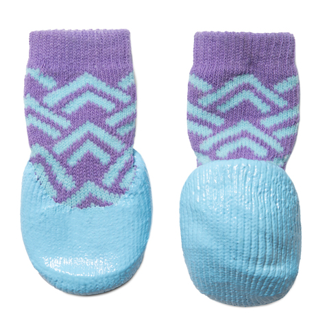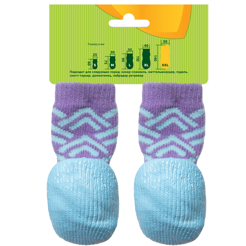 Комплект носков для собак "Орнамент" состоит из четырех изделий, выполненных преимущественно из хлопка с водостойким нитриловым покрытием на подошве. Нитриловое покрытие изготавливают из искусственно синтезированного каучука, пришедшего на смену натуральному латексу. Нитрил не вызывает аллергии, более прочный и износостойкий. Используя такие носочки на улице, Вы защитите лапы собаки от снега, слякоти, реагентов и порезов. В домашних условиях такие носочки ограждают интерьер от когтей любимца и, благодаря противоскользящему покрытию, позволяют четвероногому питомцу с комфортом передвигаться по паркету, кафелю и другим скользким покрытиям. Носочки легко одевать, а благодаря эластичным резинкам они не слезают с лап животного. Изделия просты в уходе и избавят вас от регулярного мытья лап собаке после прогулки. Цвет: сиренево-голубой. Размеры изделия: 50*140мм.
