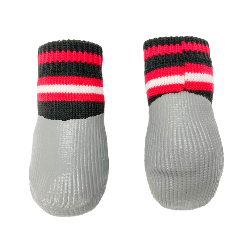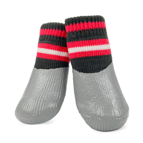 Комплект носков для собак "Полоски" состоит из четырех изделий, выполненных преимущественно из хлопка с водостойким нитриловым покрытием на подошве. Нитриловое покрытие изготавливают из искусственно синтезированного каучука, пришедшего на смену натуральному латексу. Нитрил не вызывает аллергии, более прочный и износостойкий. Используя такие носочки на улице, Вы защитите лапы собаки от снега, слякоти, реагентов и порезов. В домашних условиях такие носочки ограждают интерьер от когтей любимца и, благодаря противоскользящему покрытию, позволяют четвероногому питомцу с комфортом передвигаться по паркету, кафелю и другим скользким покрытиям. Носочки легко одевать, а благодаря эластичным резинкам они не слезают с лап животного. Изделия просты в уходе и избавят вас от регулярного мытья лап собаке после прогулки. Цвет: серо-черный с красным. Размеры изделия: 25*60мм.