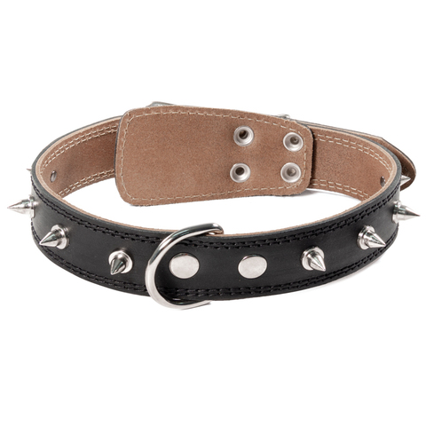 Стильный кожанный ошейник с крупными металлическими шипами подойдет для собак крупных пород весом от 35 кг., обхват шеи 65*70 см. Варианты пород: ротвейлер, кане корсо, немецкий дог, американский бандог (кобели), бульмастиф и т.д. Изделие выполнено из прочной двухслойной кожи с использованием крепкой металлической фурнитуры. Предусмотренные отверстия позволяют удобно подгонять длину под индивидуальные параметры животного. Размеры изделия: 720мм*450мм*3мм. Цвет: черный.
