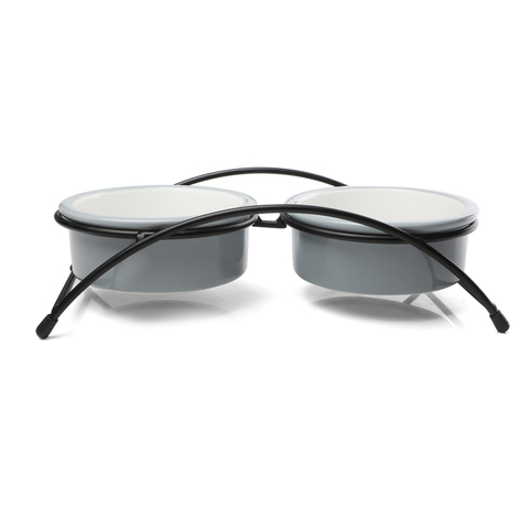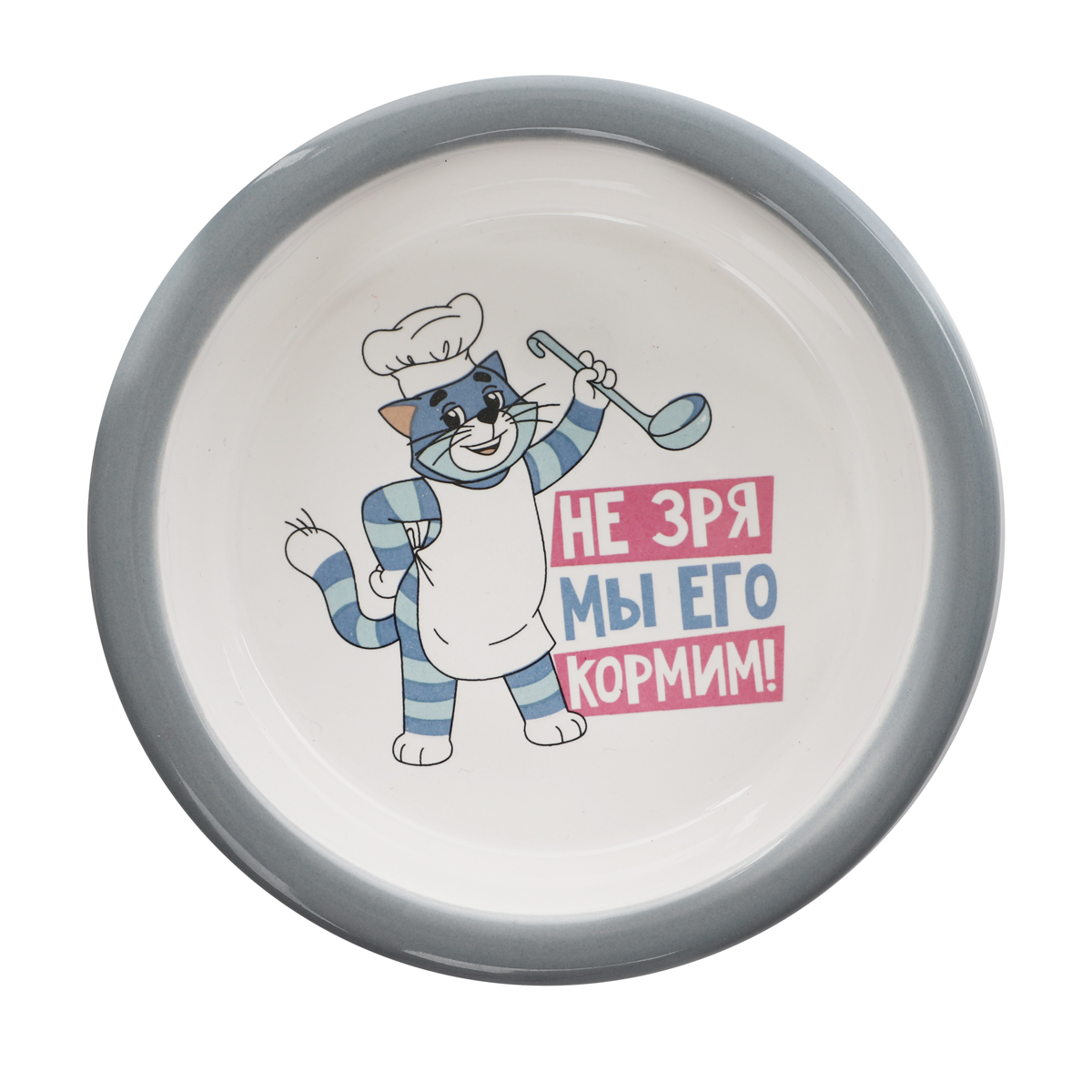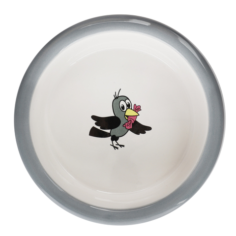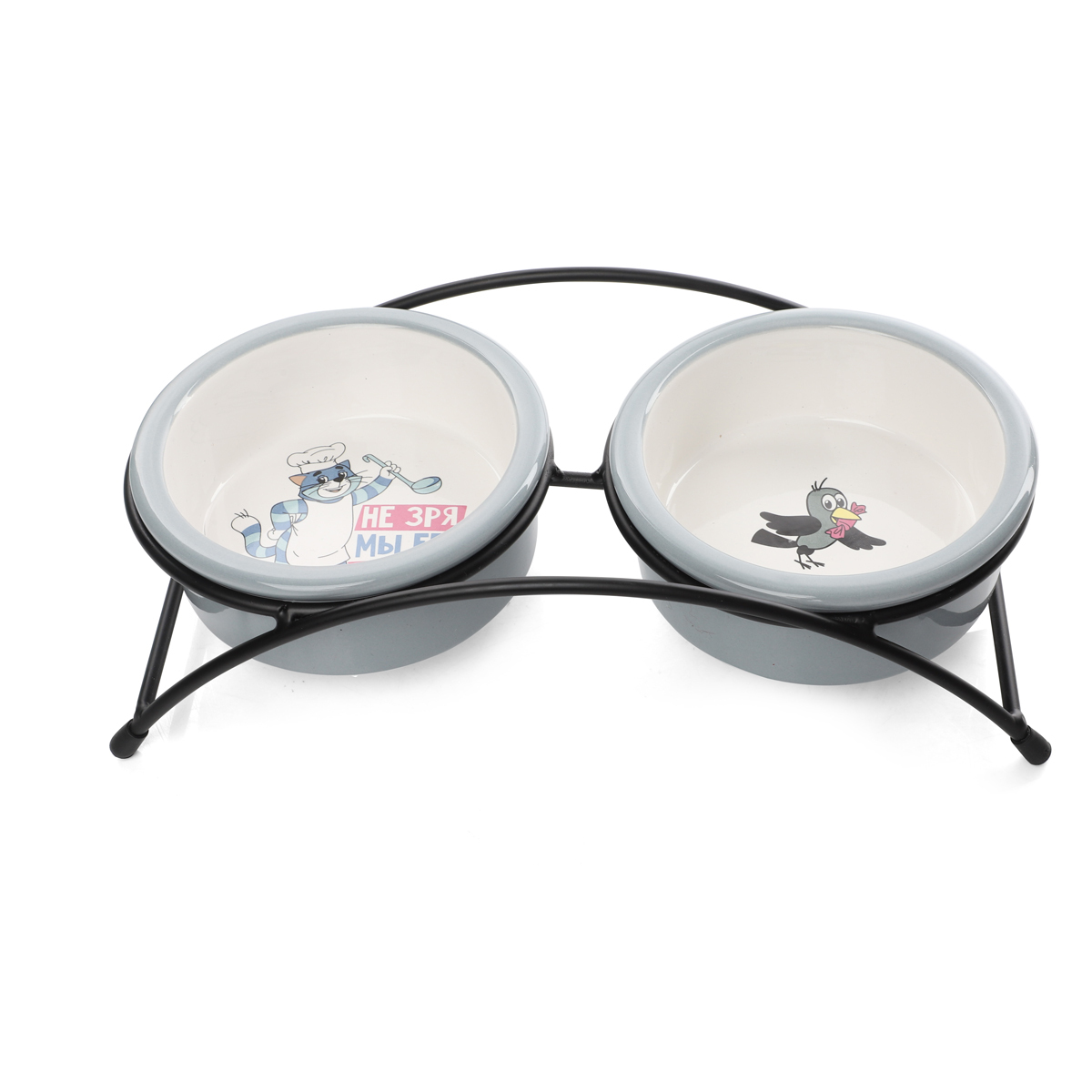 Этот функциональный комплект из двух универсальных круглых мисок на подставке выполнен из керамики высокого качества и отлично подходит для кошек и собак мелких пород. Такие миски идеальны как для воды, так и для корма разной консистенции. Изделие комфортно для питомца и легко моется под струей проточной воды с использованием бытовых моющих средств. А эффектный дизайн с персонажами известного советского мультфильма позволит ей стать украшением любого интерьера. Цвет изделия: серый с белым. Размер изделия: d дна - 112мм; d в верхней части - 125мм; высота - 45мм. Размер подставки - 280*135*65мм. Объем - 2*0,25л.
