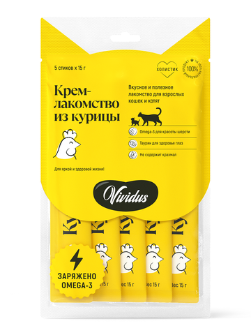 Крем-лакомство VIVIDUS - это вкусное и полезное лакомство для котят и взрослых кошек. Вкусняшки для животных изготовлены из отборных ингредиентов, которые по стандартам подходят для питания людей. Все продукты обогащены omega-3, таурином и витаминами. Влажный крем паштет для котов из курицы, тунца или лосося - источник легкоусвояемого белка. Натуральный кошачий жидкий крем лакомство содержит таурин для поддержания здоровья глаз. Содержат дневную норму omega-3 для здоровья и красоты кожи и шерсти. Витамины А, Е, В2, D3 помогут любимому питомцу поддерживать активность и хорошее самочувствие в течении всего дня. Ваш котик полюбит такое угощение. Премиальный жидкий мясной корм Вивидус НЕ СОДЕРЖИТ крахмал. Крахмал - дешёвый бесполезный наполнитель, который может быть даже вреден кастрированным и домашним кошкам, ведущим малоподвижный образ жизни.