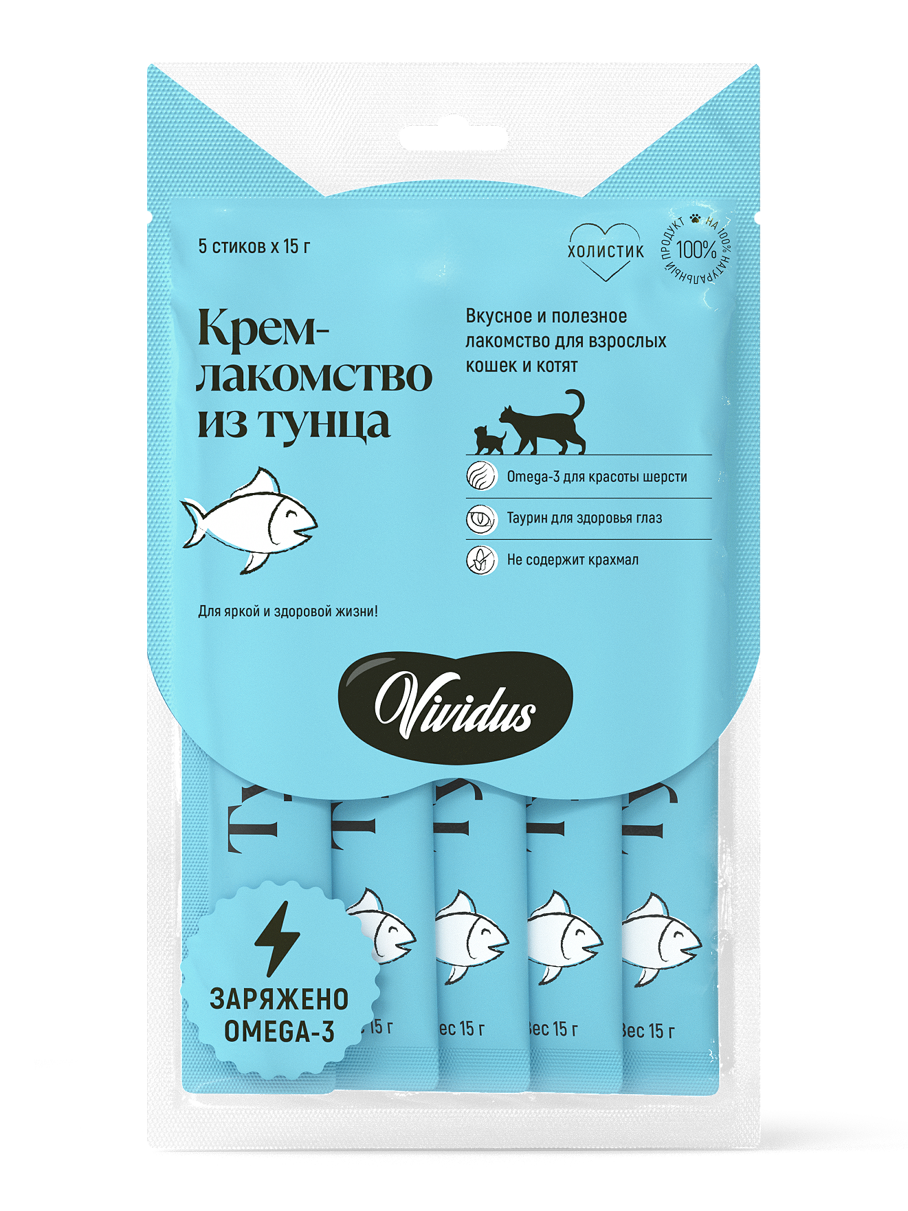 Крем-лакомство VIVIDUS - это вкусное и полезное лакомство для котят и взрослых кошек. Вкусняшки для животных изготовлены из отборных ингредиентов, которые по стандартам подходят для питания людей. Все продукты обогащены omega-3, таурином и витаминами. Влажный крем паштет для котов из курицы, тунца или лосося - источник легкоусвояемого белка. Натуральный кошачий жидкий крем лакомство содержит таурин для поддержания здоровья глаз. Содержат дневную норму omega-3 для здоровья и красоты кожи и шерсти. Витамины А, Е, В2, D3 помогут любимому питомцу поддерживать активность и хорошее самочувствие в течении всего дня. Ваш котик полюбит такое угощение. Премиальный жидкий мясной корм Вивидус НЕ СОДЕРЖИТ крахмал. Крахмал - дешёвый бесполезный наполнитель, который может быть даже вреден кастрированным и домашним кошкам, ведущим малоподвижный образ жизни.