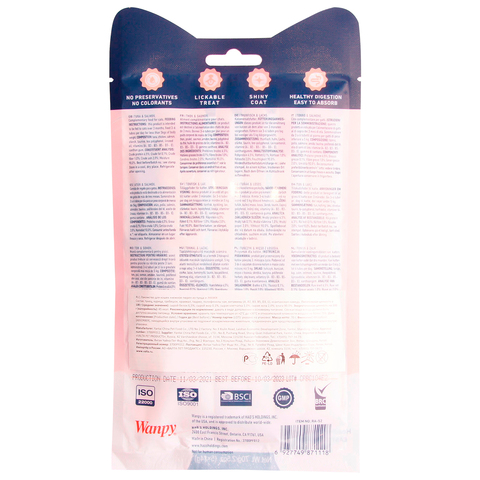 Состав: тунец, курица, лосось, крахмал, таурин, полифенолы чая, льняное масло, витамины (A, B2, B3, B5, D3, E), ксантановая камедь.