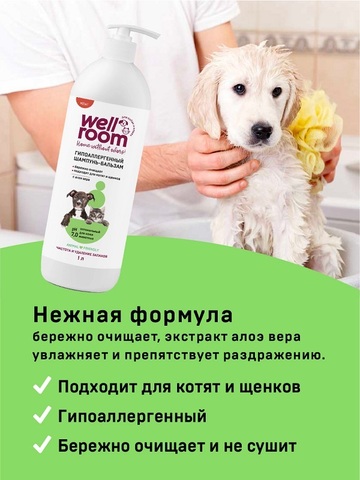 Wellroom шампунь гипоаллергенный для котят, кошек, щенков, собак 1л