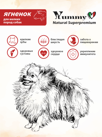 Состав: дегидрированное мясо и мясопродукты (ягненок не менее 25%), рис 21%, картофель, горох, жир индейки, свекольная пульпа, соус из печени курицы, льняное семя, автолизат пивных дрожжей (натуральный источник пребиотиков MOS), экстракт цикория (натуральный источник пребиотиков FOS), лососевое масло, экстракт юкки Шидигера, L-лизин, L-карнитин, лецитин, гидролизованные хрящи (источник хондроитина), гидролизованные ракообразные (источник глюкозамина), тимьян, розмарин, экстракт корня женьшеня, витамины и минералы.