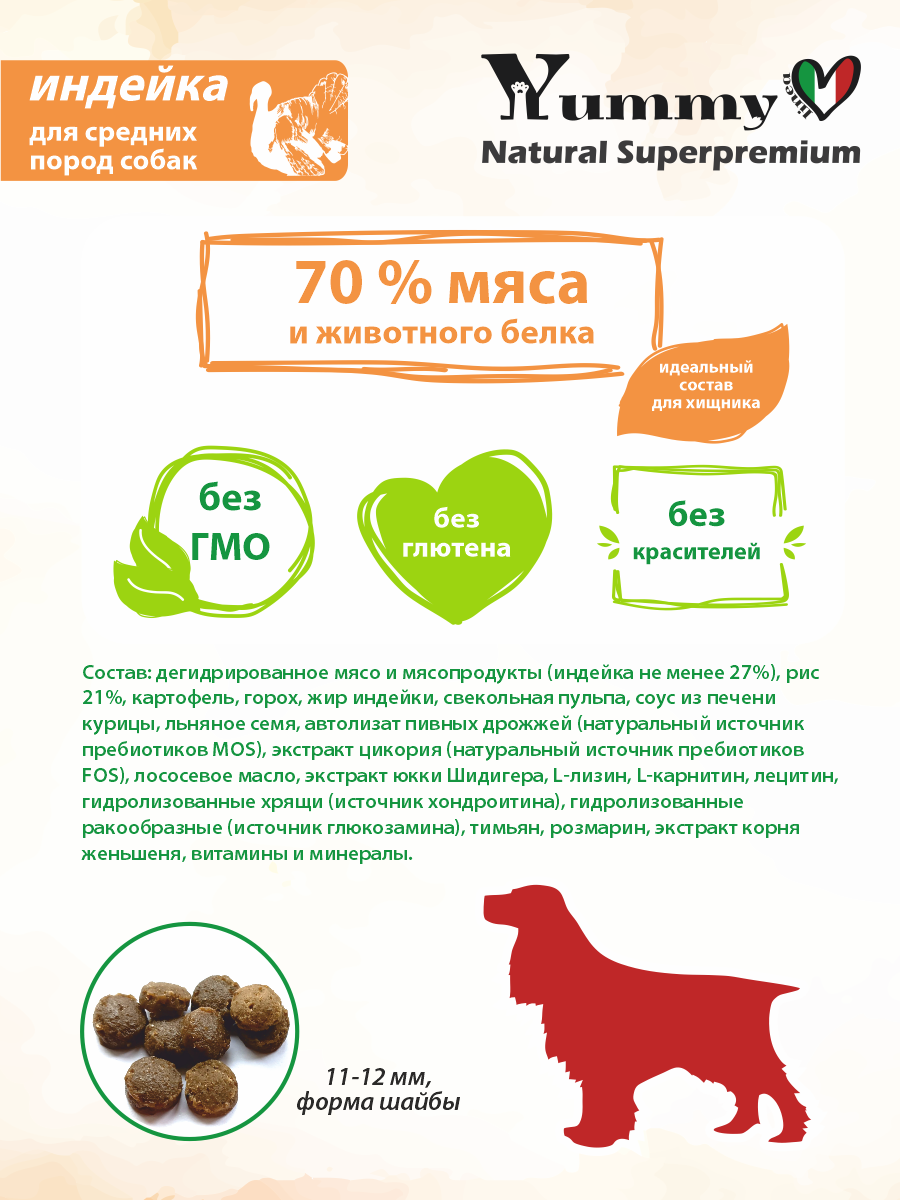 Состав: дегидрированное мясо и мясопродукты (индейка не менее 27%), рис 21%, картофель, горох, жир индейки, свекольная пульпа, соус из печени курицы, льняное семя, автолизат пивных дрожжей (натуральный источник пребиотиков MOS), экстракт цикория (натуральный источник пребиотиков FOS), лососевое масло, экстракт юкки Шидигера, L-лизин, L-карнитин, лецитин, гидролизованные хрящи (источник хондроитина), гидролизованные ракообразные (источник глюкозамина), тимьян, розмарин, экстракт корня женьшеня, витамины и минералы.