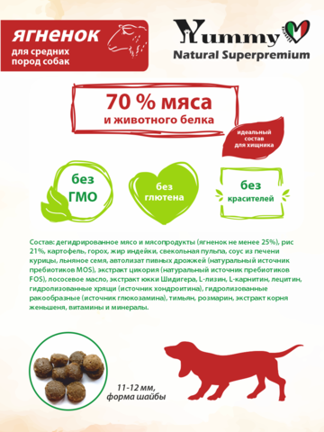 Состав: дегидрированное мясо и мясопродукты (ягненок не менее 25%), рис 21%, картофель, горох, жир индейки, свекольная пульпа, соус из печени курицы, льняное семя, автолизат пивных дрожжей (натуральный источник пребиотиков MOS), экстракт цикория (натуральный источник пребиотиков FOS), лососевое масло, экстракт юкки Шидигера, L-лизин, L-карнитин, лецитин, гидролизованные хрящи (источник хондроитина), гидролизованные ракообразные (источник глюкозамина), тимьян, розмарин, экстракт корня женьшеня, витамины и минералы.