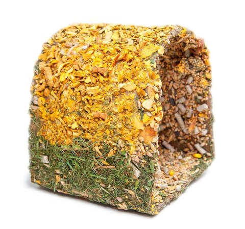 "Домик Братца Кролика" - лакомство-игрушка для крупных домашних грызунов. Имеет максимально удобную форму-шалаш с плоским дном. Благодаря разнообразному составу - превосходно и правильно утоляет голод. За счет идеальной твердости помогает в обязательном стачивании зубов. Служит удобным местом для ночлега/укрытия, имитируя естественные условия обитания. Высушенные по специальным технологиям овощи, фрукты и премиум сено, являются приятным витаминным и ароматным бонусом для животных.