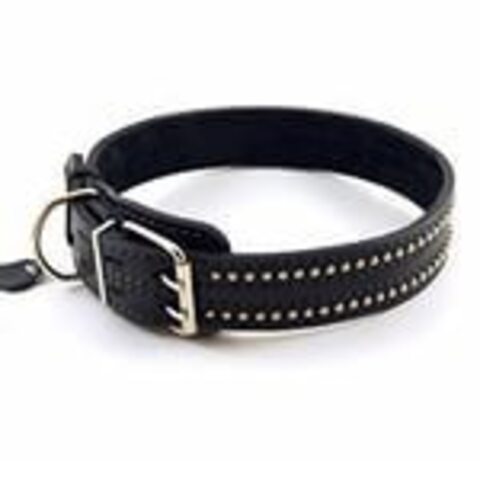 Эта модель ошейника подходит для крупных собак. Сделан ошейник из аккуратно сшитых друг с другом кожаных полос, что делает ошейник очень удобным и мягким для собаки. Черный цвет можно использовать для мальчиков и для девочек отдельных пород собак. Ошейник декорирован двумя рядами металлических заклёпок, подчеркнутых также ровной строчкой. Заклепки надежно заделаны между слоями кожи, поэтому не будут мешать вашей собаке. Застежка сделана с двойной собачкой. Кроме этого, к ошейнику легко пристегнуть поводок.