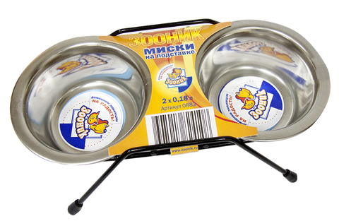 Подставка низкая под миски для собак, с двумя металлическими мисками, черная, 2 х 180 мл. Комплект металличеких мисок на подставке от Зооник. В комплект входит подставка из металла и две миски из нержавеющей стали, одну из которых, например, можно использовать для корма, а вторую - для воды. Чтобы конструкция оставалась устойчивой и не скользила по полу, на ножках есть специальные резиновые наконечники. Миски надежно держатся на подставке, а подставка на полу, это не даст животному перевернуть конструкцию во время еды. Миски устойчивы к механическим воздействиям и ржавчине. Комплектация: 2 миски с объемом по 180 мл, подставка Цвет подставки: черный