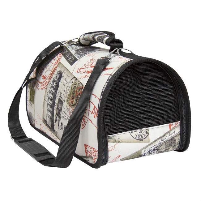 Сумки-переноски шьются из качественной ткани ПВХ с разнообразными рисунками. Внутри сумки плотная подкладочная ткань ПВХ черного цвета. Окно из плотной сетки (исключающие разрыв сетки под действием когтей). Форму держит за счет вставленного в дно куска ДВП и вставленного в стенки листа гибкого пластика.
