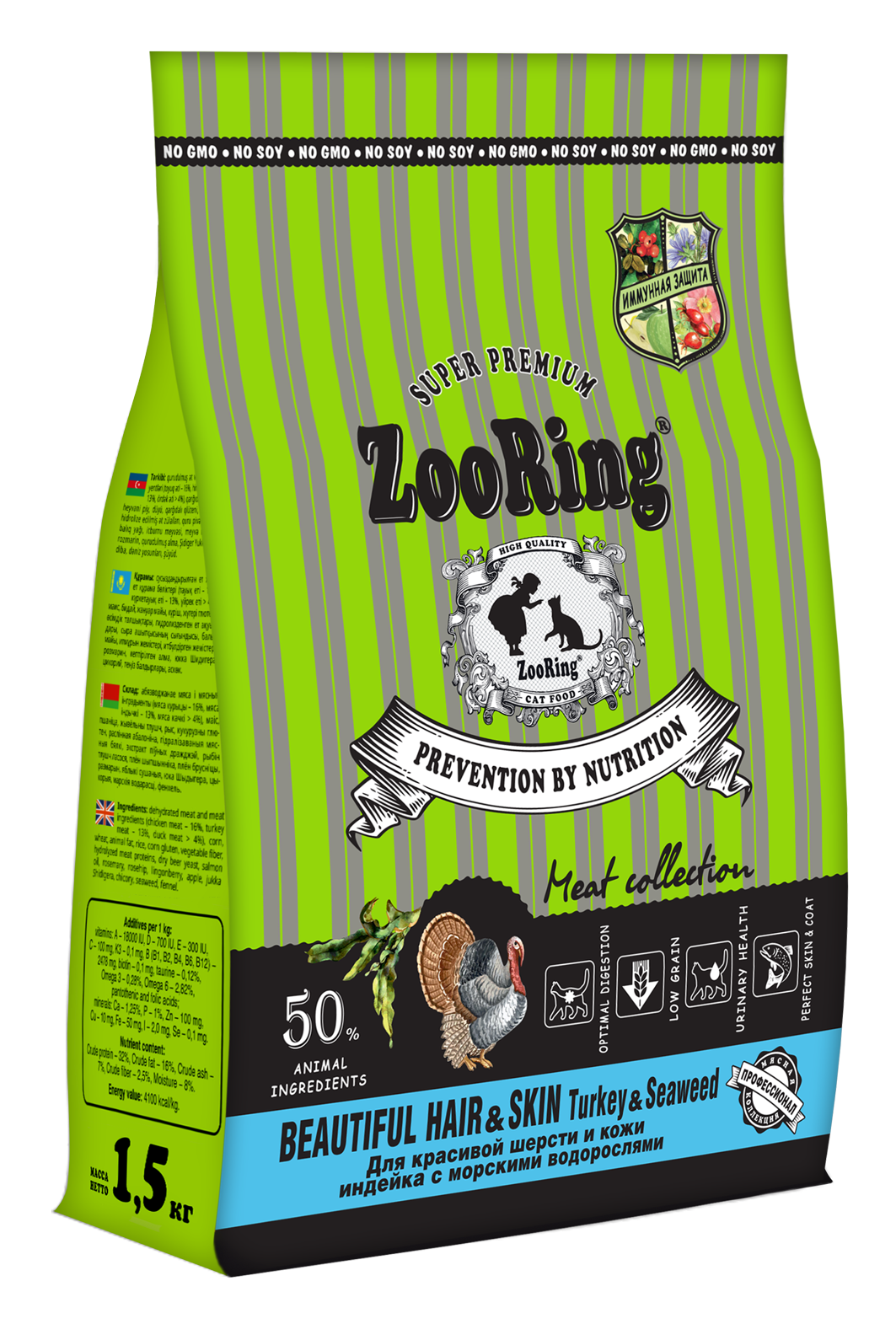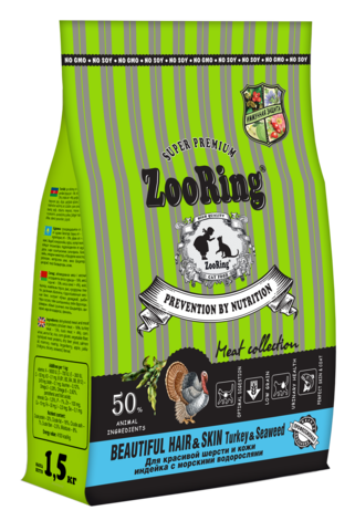 Корм ZooRing Beautiful Hair Skin Turkey Seaweed — это полнорационный сухой корм супер-премиум класса для взрослых кошек и котов всех пород. Он содержит богатую мясную смесь, разработанную ведущими нутрициологами-диетологами, что обеспечивает полноценное питание и быстрое насыщение питомца.